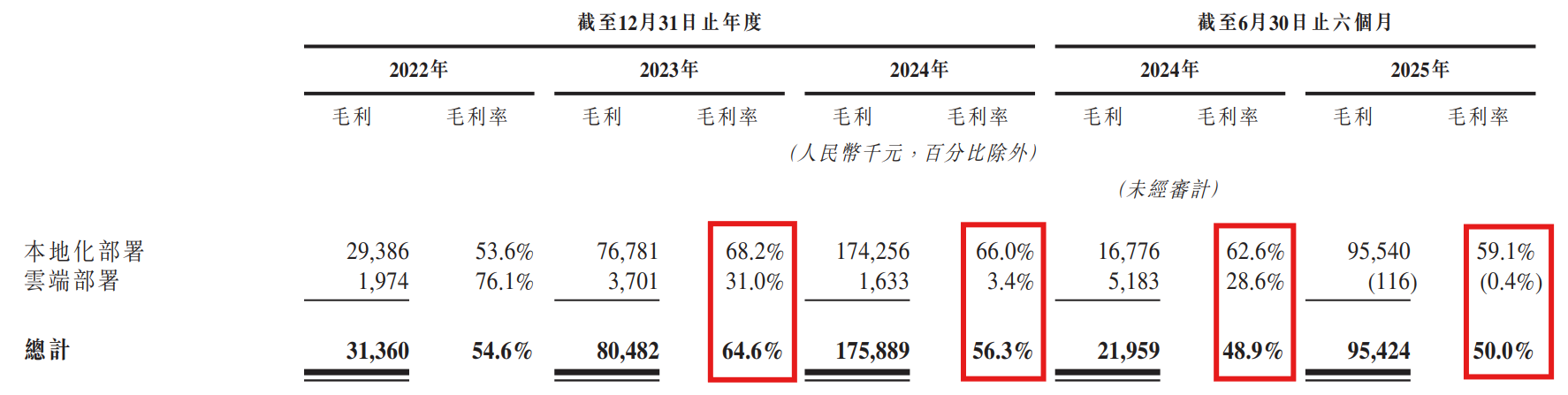 先来看毛利率,MiniMax 2023年毛利亏损,2024年转正到12.2%,2025年爬到23.3%。智谱好一些,最近3年稳定在50%-60%,这是由于toB/toG的单子通常要求本地化部署(占比接近70%),也就是客户自己承担了大部分的推理开销。2025上半年云端部署的毛利率甚至是负的,