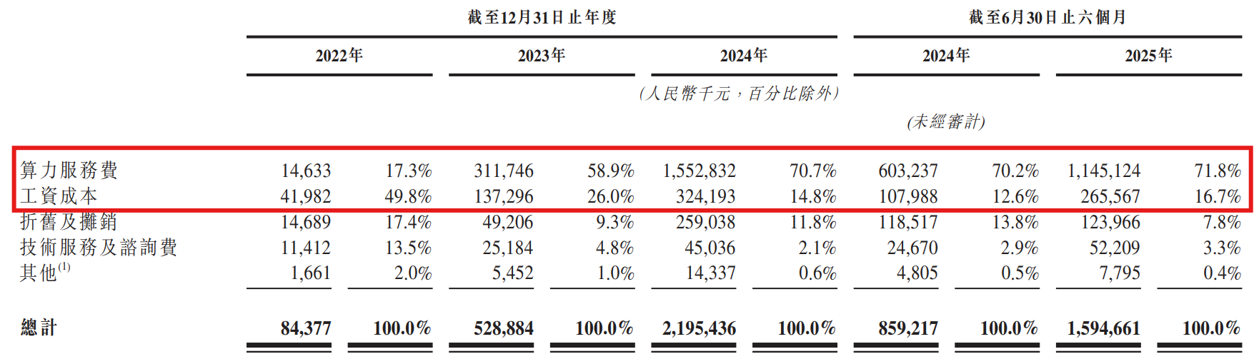 什么东西要占那么多研发费用?当然是训练模型所需的算力,智谱披露的数据显示这一项占比高达70.7%,第二项工资成本占14.8%: